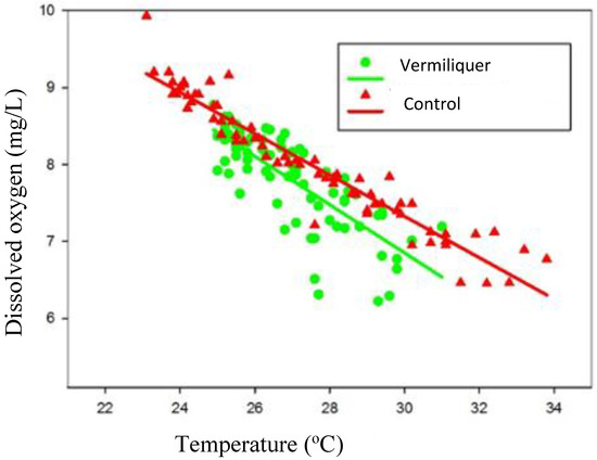 A close relationship was evident between the dissolved oxygen concentration and the temperature of the solution within the reservoir, highlighting the importance of insulation for an enhanced supply of oxygen (Figure 4). The separate relationships between temperature and dissolved oxygen for control and vermiliquer is akin to the reported difference in dissolved oxygen concentration between pure water and vermicompost tea made from chicken manure [4].