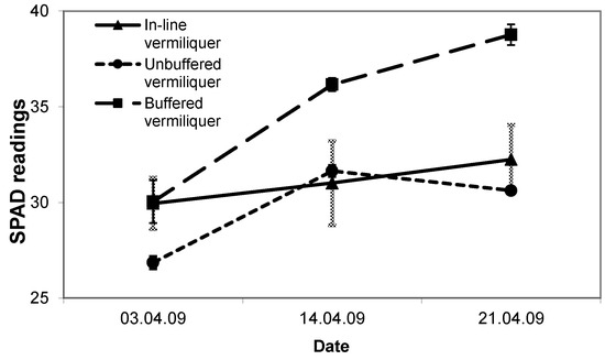 Trend in SPAD readings (arbitrary units) over time in the in-line, the buffered and unbuffered batch vermiliquer treatments in Study V, transplanted 26 March 2009. Vertical bars represent SD of the mean.