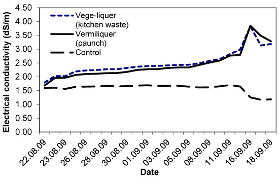 The initial EC of the ‘mature’ vermiliquer (Table 1) was similar to other published values for EC in leachate from vermiculture [7]. Measured values of 1.5 dS/m–2.6 dS/m generally compared favourably with values of inorganic hydroponic systems [13]. The EC is often used as a surrogate for nutrient concentration (i.e., the strength of the nutrient solution [13]), although it does not account for the individual losses or retention of specific ions in the solution. It is possibly also a suitable surrogate for nutrient concentration in vermiliquer-based hydroponics, for while the EC in the inorganic control treatments fell below 0.4 dS/m by harvest, indicating near depletion of nutrients, for vermiliquer EC did not drop and indeed by the end of most studies it increased (e.g., Study VI, Figure 6).