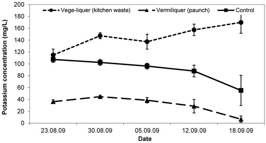 Initial potassium concentration in the vege-liquer (with kitchen waste) solution was the same (ca. 110 mg/L) as in the control (Figure 7). Potassium in the vermiliquer obtained from ‘paunch’ was significantly lower (ca. <40 mg/L) than in the other two treatments. During the study, potassium concentration decreased in the control and dropped close to immeasurable in the ‘paunch’ vermiliquer (as it did in other studies), while in the vege-liquer it increased (Figure 7). Potassium in sap was greatest in the control and vege-liquer (200–300 mg/L) compared with the vermiliquer (140–180 mg/L) and likewise in the harvested pak choi potassium concentration was highest in the control and least in the vermiliquer (Table 3).