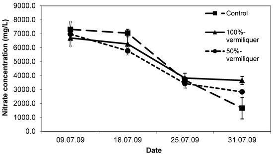 Trend in nitrate concentration (mg/L) in sap in the control, 100% and 50% vermiliquer treatments over time in Study VIII, transplanted 29 June 2009. Vertical bars represent SD of the mean.