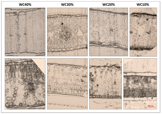 The leaf anatomical modifications are species-specific. Thus, in Polygala and Viburnum plants subjected to four levels of irrigation treatments through the use of dielectric sensors (EC 5TE, Decagon Devices, Pullman, Washington, USA) to maintain the substrate water content (WS) equal to 10% (WC10%), 20% (WC20%), 30% (WC30%), and 40% (WC40% = control) of the pot volume, the leaf anatomical modifications were linked to spongy tissue in Polygala and palisade tissue in Viburnum (Figure 1).