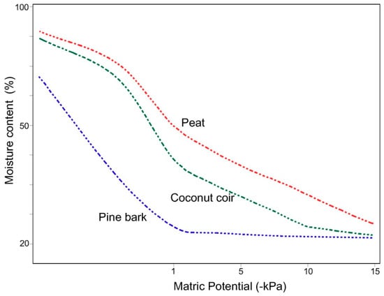 Evapotranspiration rates depend on greenhouse environmental conditions, and are also affected by the water supply to the roots [91]. For scheduling irrigation, hydraulic properties and water content dependence on substrate suction must be known as they influence the water movement and retention in the substrate [91,92,93]. Water retention curves or moisture characteristic curves relate the water content in a specific substrate to the matric potential at a given tension or height [94]. Different kinds of substrates, as Fields et al. [95] indicated, have different water retention curves (Figure 1).