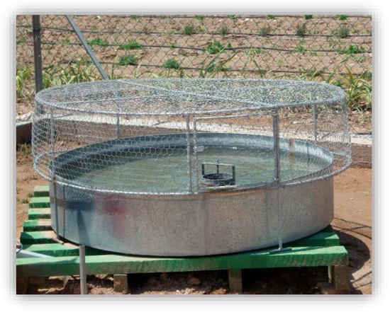 Class A evaporation pans (Figure 2) are considered one of the most widely used systems for climatic measurements in the estimation of the evapotranspiration rate for open field and protected cultivation, because of their simplicity and low cost [2,48]. The pan has proven its practical value and has been used successfully to estimate reference evapotranspiration by observing the evaporation loss from a water surface and applying empirical coefficients to relate pan evaporation to reference evapotranspiration (ETO) [116].