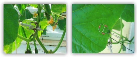 Stem micro-variation sensor (left) and a contact leaf temperature sensor (right).