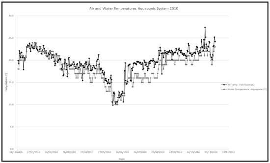 Because both systems were similarly affected in terms of water temperature, the water temperature was consistently similar in both systems, so can be ruled out as a point of specific difference (hydroponic data not reported here). However, the fish used in the aquaponics system, Asian Grass Carp (