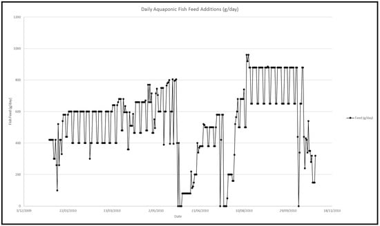 6]. Therefore, it is the amount of fish feed that enters the aquaponic system on a daily basis and that is eaten and converted to waste products by the fish that determines the overall plant nutrient provision, rather than any specific stocking density of fish or any applied technological approach [