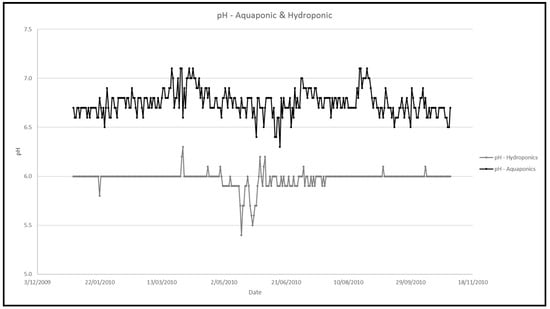 26] compared lettuce growth in a hydroponic analogue (rainwater with hydroponic nutrients added to achieve a desirable nutrient concentration or conductivity—1800 µS/cm) to that in an aquaponic analogue (30% RAS water plus 70% rainwater plus added hydroponic nutrients in order to achieve the same desirable nutrient concentration or conductivity), and demonstrated a greater growth of lettuce in the aquaponic analogue. Again, this study demonstrated the potential of aquaponics to provide advanced plant growth rates, but not within a normally operating aquaponic context with fish actively eating.