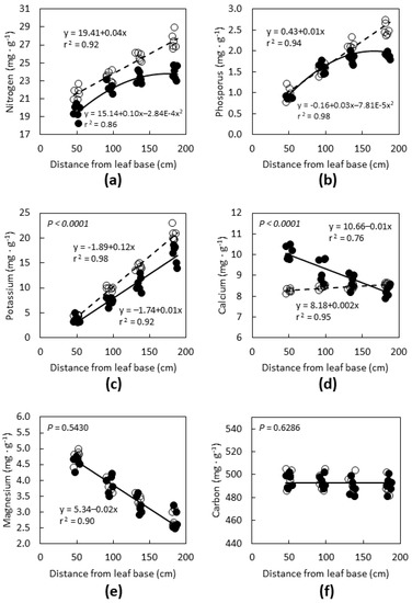 All elemental response variables were fitted to linear and quadratic models, with position along the rachis as the independent variable. The Proc GLM procedure in SAS (SAS 9.3; SAS Institute, Cary, NC, USA) was employed for this procedure. If the regression model for old leaves differed from that for new leaves, we did not pursue further analyses. If the regression model was the same for both leaf age classes, we employed analysis of covariance to determine if leaf age influenced the slope of the model. Leaf age was designated as the covariate, and elemental response variables were treated as the dependent variable, and distance along the rachis was treated as the independent variable.