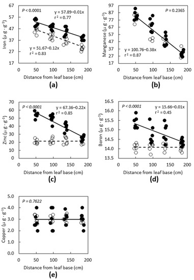 The influence of leaf age and position along the rachis differed among the micronutrients. Leaf Fe declined linearly from basal to terminal leaflets, and leaf age influenced the slope (Figure 3a). Old leaves contained greater Fe concentration than new leaves, regardless of position along the rachis. Leaf Mn concentration declined linearly with distance from the leaf base, but leaf age did not influence the slope (Figure 3b). Young leaves exhibited a Zn concentration of about 20 µg·g−1 regardless of position along the rachis (Figure 3c). Old leaves exhibited a linear decline in Zn concentration from basal to terminal leaflets, with similar concentrations to the young leaves for the terminal leaflets. The pattern of leaf B concentration and the influence of leaf age on B were similar to those of Zn (Figure 3d). Position along the rachis did not influence leaf Cu concentration, with a mean of 3 µg·g−1 for both leaf age categories (Figure 3e). The variation of Cu concentration among the replications was substantial.