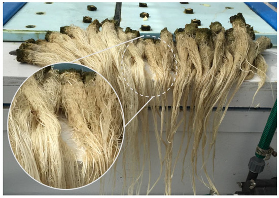 A magnification of individual lateral root strands from either hydroponic (on left) or aquaponic (on right) grown lettuce using deep-water culture methods (hydroponic treatment has the bold upper left root lateral shown).