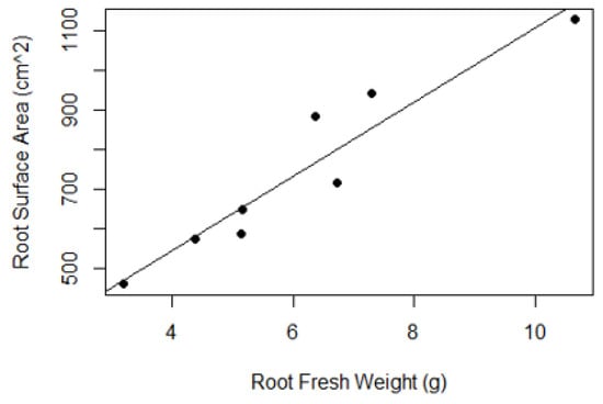The regression equation was found to be significant (F (1, 6) = 53.7, P = 0.00033), with an R2 of 0.90 and an adjusted R2 of 0.88 (Equation (2)). Surface area increased 94 cm2 for each gram of root fresh-weight. Some modelers may develop lettuce growth models starting from seed when there is no shoot mass, so we also provide a model where the intercept is forced to zero. For this case, the slope is ~119 cm2 per gram of root fresh-weight; the equation is not shown.