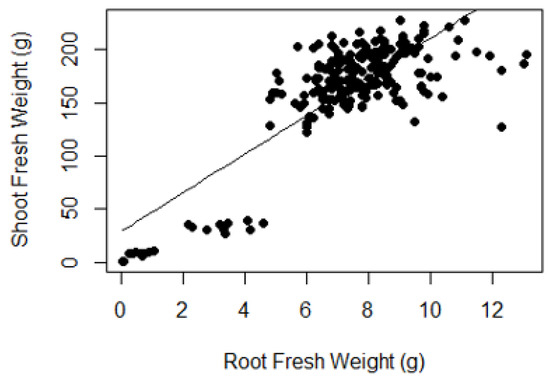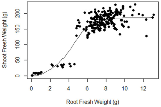 A simple linear regression was also done to predict shoot fresh weight on root fresh weight (Figure 5). The regression equation was significant (F (1, 220) = 450.5, P < 2.2 × 10−16), with an R2 of 0.67 and an adjusted R2 of 0.67 (See Equation (5)). Shoot fresh-weight increased 18.1 g per gram of root fresh-weight. If the intercept is forced to zero, then the slope is ~21.8 g per gram of root fresh-weight (equation not shown). The Gompertz model (Equation (4)) compared to the linear model (Equation (5)) predicts heavier shoot fresh weights as roots increase in weight above 5 g, which in turn would then predict larger root surface areas. The linear model would predict smaller or more conservative surface areas as a function of shoot fresh weight and might be preferred for this reason for design purposes.