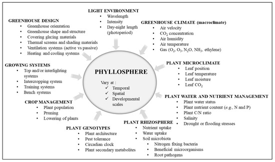 Controlled environments, such as greenhouses, polytunnels, and plant factories, reduce the amplitude of fluctuations in the crop environment, which in turn affects plant performance and the structure and function of the associated microbiome. Greenhouse-covering materials and shade netting alter prevailing environmental conditions (e.g., temperature, relative humidity, and carbon dioxide (CO2) concentration), but also conditions at the crop level and in the crop phyllosphere, as they influence greenhouse light transmission, reflection, absorption, and diffusion within the canopy [38,39,40]. Figure 1 summarizes the most important growth parameters affecting the phyllosphere of greenhouse crops.