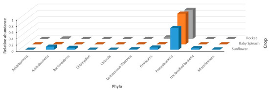 Bacterial phyllosphere community structure of some greenhouse crops artificially illuminated with high-pressure sodium lamps (HPS). Blue: sunflower, Helianthus annuus L. [51]. Orange: baby leaf spinach (Spinacia oleacea); grey: rocket (Diplotaxis tenuifolia) [Alsanius, unpublished data]. (Illustration: B. Alsanius).