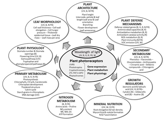 The light spectrum also influences the accumulation of plant primary and secondary metabolites [106]. For example, accumulation of soluble sugars, starch, soluble protein, and polyphenols is higher when crops are grown under monochromatic red or blue than white light [107,108,109,110,111,112,113], which may impact the phyllobiome. Indeed, the phyllosphere microbiota uses leaf surface resources, such as amino acids, carbohydrates, and organic acids, passively leaked by plants [114]. A combination of red, blue, and white light enhances soluble sugar and nitrate concentrations in basil plants [115]. However, a low R:FR ratio downregulates the activity of the key enzymes involved in nitrogen assimilation (nitrate reductase, nitrite reductase, and glutamine synthase), which may impact cell metabolism [58]. Blue light and mixtures of red, blue, and green light increase ascorbic acid accumulation in leafy vegetables [84,116,117], while UV-A may reduce ascorbic acid content [118]. Anthocyanin leaf content is usually promoted by UV-A, UV-B, and blue light [75]. In particular, UV-A, blue, and red light increase the anthocyanin level in leafy vegetables, while green light reverses blue-light-induced anthocyanin accumulation [94,118,119,120]. Sulfur-containing secondary metabolites, such as glucosinolate, which can protect the plant against predation and pathogens, may also be promoted by blue light or a mixture of red, blue, and green light [121,122,123]. The R:FR ratio also impacts accumulation of phenolics in different species [115,124]. In addition, light affects the synthesis, profile, and emission of volatile organic compounds (VOCs) by plants, which increases plant attractiveness to plant parasitoids and orientation of predators [124,125]. Release of VOCs from leaves increases when they are exposed to UV, white light, or a low R:FR ratio, although this effect may be species-specific.
