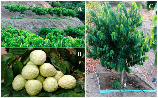 (A) Terraced cherimoya plantation, (B) cherimoya fruit Annona cherimola cv. Fino de Jete, and (C) drainage lysimeters used for the study.
