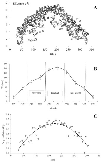 Figure 2A displays the reference crop evapotranspiration (ET0) throughout the study period for both production systems, showing a typical Mediterranean pattern. The ETc increased in agreement with the crop water demand, especially during development of fruits in the tree (Figure 2B). Overall, ETc was higher during the summer months, especially in July, with the maximum monthly average ETc for cherimoya being 4.6 mm day−1 or 164.7 L·tree−1 day−1 during the fruit-set phenological stage.