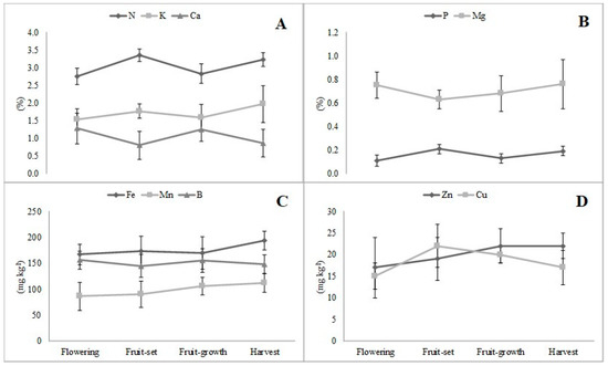 The content of nutrients in relation to phenological stages throughout the production cycle for conventional and organic cherimoya trees were almost similar. In this sense, Figure 3 depicts the overall pattern of pooled leaf mineral contents for both systems, revealing similar trends with respect to N, P, and K use, with post-harvest accumulation and low levels during flowering and fruit growth, especially for N and K. These trends were the opposite for Ca and Mg. Fe, Zn, Mn, Cu, and B concentrations rose during harvest and fell during flowering. The lower energy demand of cherimoya trees during harvest presumably encouraged the accumulation of reserves. The greater foliar K (1.98%) content during this stage could provoke Mg translocation to other organs, as pointed out by Adiscott [25]. The flowering process reduces the N concentration, probably due to cell division and elongation of new spring shoots [26]. Also, the lower foliar P during flowering may be ascribed to the production of nucleic acids and coenzymes, which are fundamental for photosynthesis. K also fell during flowering, possibly because of the translocation toward new cherimoya tissues, where K is crucial to activate enzymes and regulate osmotic pressure.