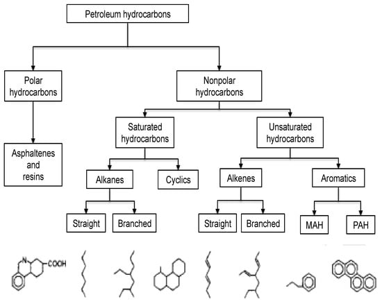 Chemical classification of petroleum hydrocarbons. (MAH = Monoaromatic hydrocarbons; PAH = Polycyclic aromatic hydrocarbons). Source: Coulon and Wu [].