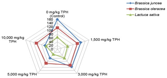 On agricultural lands, Plice [] and also De Jong [], reported that oil spills can result in reduced plant growth for some time. PH contamination which is associated with an increase in carbon/nitrogen (C/N) ratio and nitrogen deficiency [], may also lead to a reduction in plant stem height, stem density, aboveground biomass, and include death of the plant [,,,,]. Meanwhile, the response of plants to the presence of PH in soil varies [,,] and is associated with the plant age [], species of the plant involved, type and concentration of the petroleum, time of exposure to the contaminant [,,] as well as the season [,], among other factors.