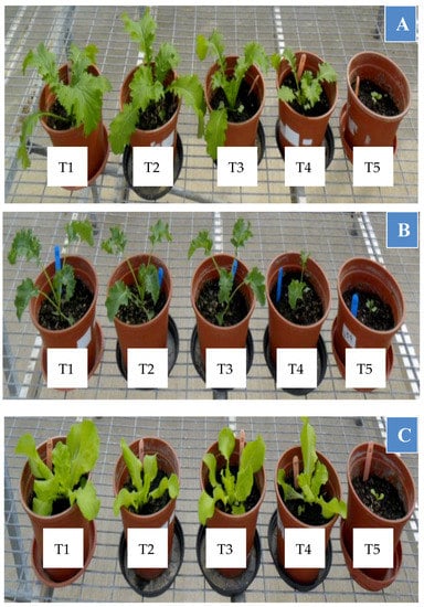 The growth of three green leafy vegetables ((A) B. juncea, (B) B. oleracea and (C) L. sativa) in pots containing crude oil at different concentrations. Treatments T1, T2, T3, T4 and T5 are 0 mg/kg TPH (Control), 1500 mg/kg TPH, 3000 mg/kg TPH, 5000 mg/kg TPH, and 10,000 mg/kg TPH, respectively. Source: Odukoya [].