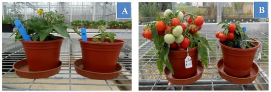 Growth of Micro-Tom tomatoes in pots containing crude oil at 0 mg/kg TPH (left plant) and 5000 mg/kg TPH (right plant), before fruiting (A) and during ripening (B). Source: Odukoya [].
