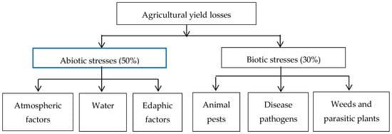 Abiotic stresses, which include environmental contaminants [], have been identified as the key factors responsible for most of the reduction in agrifood production (Figure 6); they also play a major role in determining the nutritional value/quality of fruits and vegetables during their growth, harvesting, handling, storage, and transport to end users []. The impact made by these abiotic stresses have been found to depend on the (1) the part (tissue or organ) of the plants involved [,]; (2) crop species; (3) duration; as well as (4) intensity of the stress [] and could cause morphological, physiological, biochemical, and molecular alterations within the affected plants []. Retardation of plant growth may also occur as the plants make efforts to conserve and reallocate resources that can become limited under extreme stress conditions [].