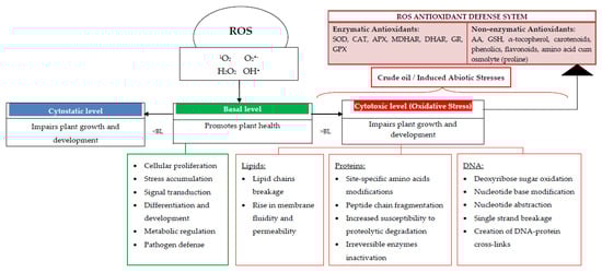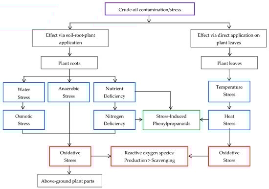 Crude oil/PH contamination, an abiotic factor [], leads to oxidative stress in plants [] and gives rise to the production of ROS. Figure 7 shows the mechanistic link between crude oil contamination/stress and identified crude oil-induced abiotic stresses.
