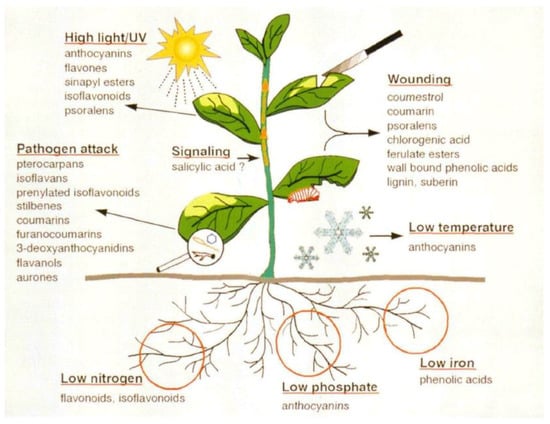 (a) Biosynthesis of stress-induced phenylpropanoids: Environmental (biotic and abiotic) stresses like pathogen attack, wounding, nutrient deficiencies, and temperature, among others (Figure 8), are capable of enhancing the levels of phenylpropanoids in plants [,].