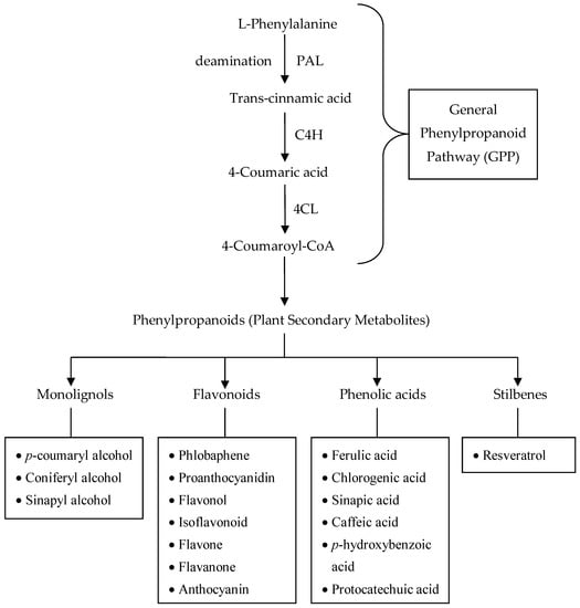 These phenylpropanoids are plant secondary metabolites [,,] derived from trans-cinnamic acid, produced from the deamination of L-phenylalanine via the action of the enzyme—phenylalanine ammonia-lyase (PAL) [,]. The other two enzymes involved in the first three steps that brings about the synthesis of these secondary metabolites (phenylpropanoid-derived compounds), which together are referred to as the general phenylpropanoid pathway (GPP) (Figure 9), are cinnamate 4-hydroxylase (C4H) and p-coumaroyl coenzyme A ligase (4CL) [].