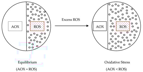 Relationship between oxidants (ROS) and antioxidants (AOX) leading to oxidative stress.