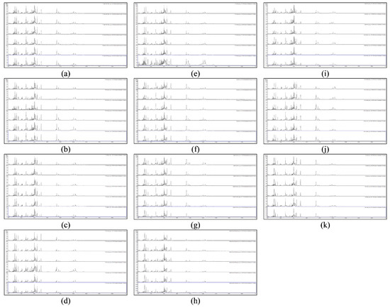 Acid-soluble seed-protein MALDI-TOF MS spectra from triplicate test-sample seeds (top) and triplicate reference-sample seeds (bottom) for S. lycopersicum/L. esculentum varieties (a) F1 Pink Baby Plum, (b) F1 Fantasio, (c) F1 Lizzano, (d) F1 Sungold, (e) F1 Tumbler, (f) Faworyt, (g) Golden Sunrise, (h) Hundreds and Thousands, (i) Indigo Rose, (j) Moneymaker, and (k) Red Alert.