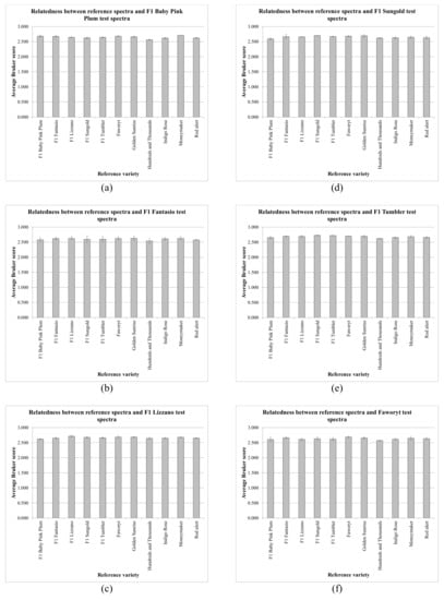 The CVs in Table 2 range between a maximum value of 1.618 (F1 Fantasio) and a minimum value of 0.148 (Golden Sunrise), with an average CV of 0.966%, implying that the average value for variance between sample preparations combined with variance between individual seeds was 0.966%−0.327% = 0.639%. For the entire set of comparisons between varieties, the average Bruker score was 2.639, with a standard deviation of 0.041. The average CV for all such comparisons was therefore 1.562%, the significance of which will be discussed below.