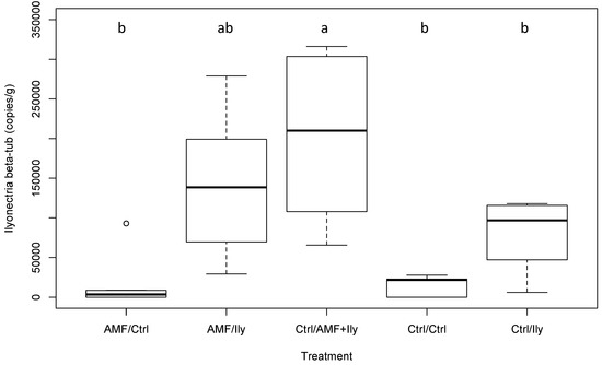 Ilyonectria beta-tubulin copy number per μL in vine roots in response to inoculation treatments. Treatments: Ctrl/Ctrl, non-microbial control; Ctrl/Ily, pathogen control inoculated with only Ilyonectria; AMF/Ctrl, mycorrhizal control, inoculated with only AM fungi; AMF/Ily, pre-inoculated with AM fungi followed later by Ilyonectria inoculation; Ctrl/AMF + Ily, co-inoculation with AM fungi and Ilyonectria. Values were obtained by digital droplet polymerase chain reaction and differences determined using a one-way analysis of variance (ANOVA; F5,41 = 5.586, p < 0.001), with differences at p < 0.05 indicated by letters above bars (Tukey’s multiple comparison via general linear hypothesis).