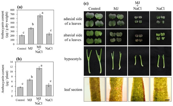 Due to their high antioxidant capacity, anthocyanins are also regarded as important contributors to the colors of fruits and vegetables, and to nutrition for promotion of human health [27,28]. In several plant species, treatment of pre- and post-harvested fruits with MJ enhanced the anthocyanin concentration of the fruits [19,29,30,31]. In vegetables, various environmental factors stimulated the production of anthocyanins in leaves, such as temperature, light, carbon dioxide, and various stresses [32,33,34]. These results suggest the existence of multiple signal cascades leading to anthocyanin synthesis. Multiple stimuli working in combination were shown to enhance anthocyanin production more strongly than was achieved when these stimuli are applied singly in several plant species [24,35,36,37]. Here, using radish (Raphanus sativus L.) sprouts as the experimental material, we examined the simultaneous effects of MJ and salinity on vegetative growth, anthocyanin accumulation, and antioxidant capacity.
