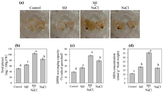 To examine the association between oxidative stress and anthocyanin accumulation, hydrogen peroxide production in sprouts treated with MJ and salinity was detected by DAB staining. Brown DAB precipitate was clearly observed in cotyledons treated with salinity alone and was enhanced in cotyledons co-treated with MJ and salinity (Figure 3a). The total phenol content was increased by MJ treatment alone and was enhanced by co-treatment with salinity (Figure 3b). Salinity treatment alone, as compared with MJ treatment alone, induced higher concentrations of total phenol (Figure 3b). Changes in DPPH, an indicator of radical scavenging capacity, followed trends similar to those of total phenol content (Figure 3c). The concentration of MDA, which is the product of oxidized lipids, was increased by single treatments of MJ or salinity to a similar extent as those of these phenolic compounds but was further enhanced by simultaneous treatment with both MJ and salinity (Figure 3d).
