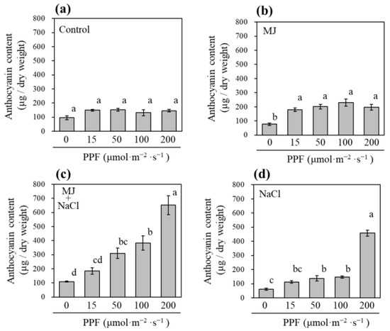 Light stimuli influenced the production of anthocyanins in leaves [11,13,40]. We thus examined the effect of light intensity on anthocyanin accumulation in the radish sprouts co-treated with MJ and salinity. Under dark conditions, anthocyanin accumulation was not detected in sprouts of all treatments (Figure 5). In sprouts co-treated with MJ and salinity, anthocyanin accumulation was clearly increased in a light intensity-dependent manner (Figure 5c). Under high light (200 μmol m−2 s−1 PPF) conditions, sprouts treated with salinity alone showed a significantly greater anthocyanin accumulation than was achieved in sprouts treated with MJ alone (Figure 5b,d).