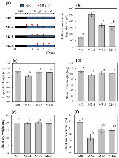 To investigate the mechanism of anthocyanin accumulation and growth suppression induced by MJ and salinity treatments, singly or in combination, we examined the effect of changes in duration of MJ treatment on the accumulation of anthocyanins in sprouts co-treated with salinity (Figure 6a). Sprouts treated with MJ from 2 to 4 DAS (M2–4) showed higher anthocyanin accumulation as compared with sprouts treated from 3 to 5 DAS (M3–5) or from 4 to 6 DAS (M4–6) (Figure 6b). The reductions in hypocotyl length and water content through the M2–4 treatment was alleviated by delaying the MJ treatment period (Figure 6c,f). The fresh and dry weights of sprouts did not significantly change between all MJ/salinity co-treated sprouts and salinity-alone-treated negative control sprouts (M0) (Figure 6d,e).