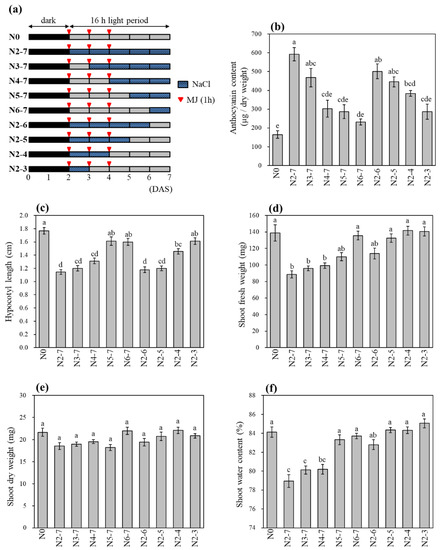 Next, we examined the effect of the duration of the salinity treatment on the accumulation of anthocyanins in sprouts co-treated with MJ (Figure 7a). Anthocyanin accumulation observed in sprouts treated simultaneously with MJ and salinity (N2–7) was more effectively suppressed when salinity treatment start times were delayed (N4–7, N5–7, or N6–7), as compared with when salinity treatment end times were shortened (N2–5, N2–4, or N2–3) (Figure 7b). In contrast, the reductions in hypocotyl length, fresh weight, and water content of sprouts induced by co-treatment with MJ and salinity were more effectively alleviated in sprouts when the salinity treatment start time was delayed (Figure 7c,d,f). The sprout dry weight did not change significantly among any of the treatments (Figure 7e).