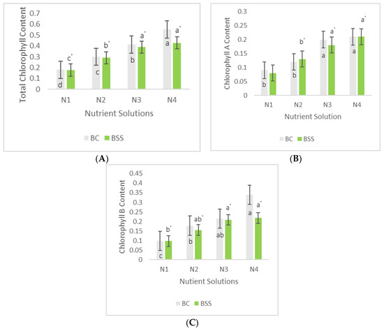 Chlorophyll content of two lettuce cultivars grown under different nutrients composition, (A) total chlorophyll, (B) chlorophyll a, (C) chlorophyll b. Means with a different letter within each cultivar are significantly different by the LSD test at p ≤ 0.05. BC: Buttercrunch; BSS: Black Seeded Simpson cultivars.