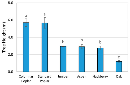 Windbreak height influences efficacy of crop protection as well as dust and chemical drift inhibition. The area protected from wind is typically 10 to 15 times the windbreak height [18]. The optimum height for dust, pesticide and noise buffering is less clear. For small acreage situations, excessively tall windbreaks may result in undesirable shading of the crop. Average tree height after five years varied among species, with the tallest trees being columnar and standard poplar at 5.71 and 5.68 m tall, respectively (Figure 1). The fast growth rate of the two poplar types was expected. Juniper, aspen, and hackberry grew at a moderate rate and produced trees that averaged 2.96, 2.92, and 2.76 m in height, respectively. Oak grew to an average height of 1.21 m. Oak species in general tend to be slow growing, and it was expected that these would not result in a tall windbreak within the short establishment period reported here. However, oak growth was also limited by repeated deer and winter injury as described above.