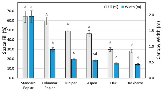 The average width and space of candidate windbreak species. Space fill (%) is shown on the left, and average tree width is shown on the right. Standard poplar showed the greatest ability to produce horizontal growth and the greatest percentage of space filled. Hackberry and oak both showed the least amount of horizontal growth and ability to fill the allotted space.