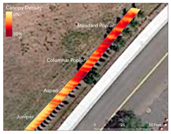 The overall canopy density across the plot was highest for the columnar poplar, followed by the standard poplar (Table 3, Figure 3). Juniper trees have the highest internal canopy density, but the overall plot density was lower, as the trees had only filled 49% of their allotted space. By comparison, the standard poplar had a more porous canopy, with 64% of the space filled, but 52% of light intercepted in the first 3 m of canopy.