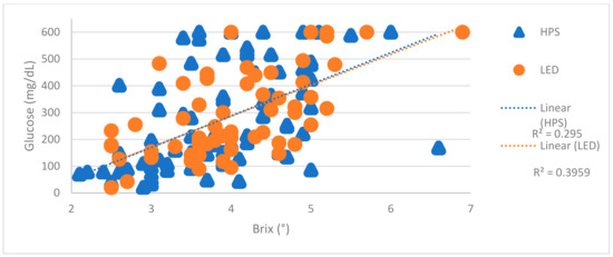 Recorded glucose responses graphed against recorded brix values. Data are raw responses of individual plants that were read for both brix and glucose. Orange dots represent LED-grown plants, and blue triangles represent HPS-grown plants. Linear regression lines are overlaid.