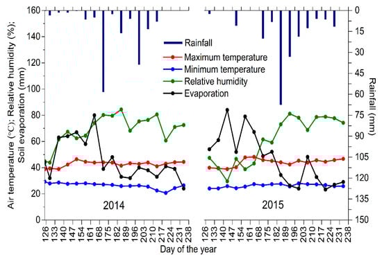 The experimental site was located in a region characterized by a subtropical, semi-arid climate with three distinct seasons: hot and dry summer (April–June) when kharif crops are grown, hot and humid monsoon (July–September), and cold winter (November–January) when rabi crops are grown. Weather data obtained from the meteorological observatory at Punjab Agricultural University, which was approximately 500 m from the experimental site, included maximum and minimum air temperatures, relative humidity, rainfall, and soil evaporation during two kharif seasons (2014–2015) (Figure 1). The weekly average maximum air temperature varied between 38.8 °C and 46.4 °C in 2014 (6 May–26 August) and between 38.9 °C and 48.2 °C in 2015 (6 May–26 August). The weekly average minimum air temperature ranged between 20.7 °C and 29.3 °C and 24.1 °C and 27.9 °C during 2014 and 2015, respectively. The weekly average relative humidity ranged from 43.9% to 84.4% in 2014 and from 29.6% to 81.1% in 2015. The experimental site received considerably less rainfall (161 mm) during the kharif season in 2014 compared to the kharif season in 2015 (197 mm). The weekly average soil evaporation rates varied from 24 mm to 80 mm and from 23.3 mm to 84 mm during 2014 and 2015, respectively.