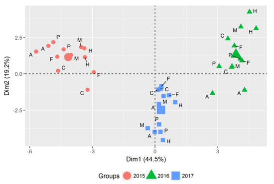 Principal Component Analysis (PCA) of the original, plot-adjusted dataset including all spinach years from 2015 (red circles), 2016 (green triangles) and 2017 (blue squares). Score plot represents the individual samples of each cultivation set (separated by color) and plot (marked by the letters A, C, F, H, M and P) based on dry biomass-related data.