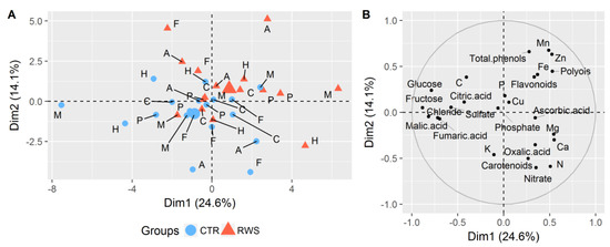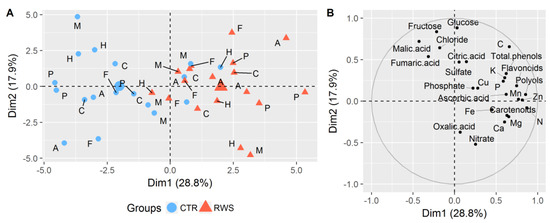Multivariate evaluation by PCA (PC1 + PC2) of the total spinach dataset including all years (2015, 2016 and 2017) based on fresh biomass-data. Score plot (A) represents all individual plot samples (marked by the letters A, C, F, H, M and P) classified according to the control (CTR, blue circles) and reduced water supply (RWS, red triangles). The corresponding loading plot (B) shows the related variables, i.e., contents of constituents as determined by the chemical analyses.