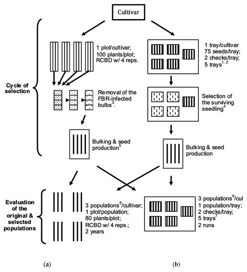 Flow chart of selection cycle and evaluation of a cultivar population via (a) Mature Bulb Selection (MBS) in a naturally FOC-infested field, and (b) Seedling Selection (SS) in a growth chamber for improving FBR resistance in onion. 1 Four trays were inoculated with fungal inoculum; 2 A fifth tray was irrigated with equal amount of distilled water. 3 FBR-infected bulbs were discarded at harvest, 4 weeks after harvest, and before seed production. 4 Small bulbs were produced before being transplanted into the field. 5 Onion is a biennial crop that requires bulb production in between seed production to complete its life cycle. All the selected bulbs were bulked into a single cage for seed production. 6 In both evaluations original, mature bulb-screened and seedling-screened populations were planted in each replication. 7 Four trays were inoculated, and a fifth tray was uninoculated.
