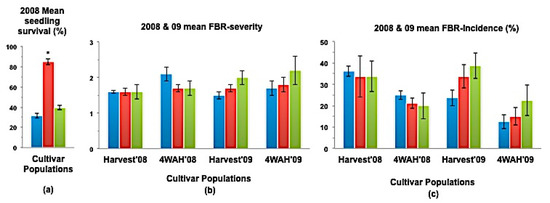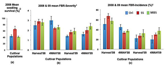 (a) Mean seedling survival; (b) Mean bulb FBR severity; and (c) Mean bulb FBR incidence (%) of NuMex Sweetpak Ori, SS, and MBS populations in 2008 and 2009 evaluations. Std. error is shown on top of each bar. Grouping legend is provided in Figure 2. (*) Significantly different from original at P = 0.05.